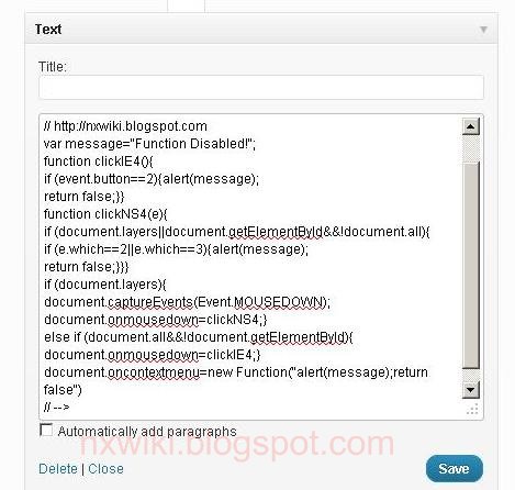 <script language=JavaScript>//Disable right mouse click Script // http://nxwiki.blogspot.com var message="Right Click Disabled!"; function clickIE4(){ if (event.button==2){alert(message); return false;}} function clickNS4(e){ if (document.layers||document.getElementById&&!document.all){ if (e.which==2||e.which==3){alert(message); return false;}}} if (document.layers){ document.captureEvents(Event.MOUSEDOWN); document.onmousedown=clickNS4;} else if (document.all&&!document.getElementById){ document.onmousedown=clickIE4;} document.oncontextmenu=new Function("alert(message);return false") // --></script>