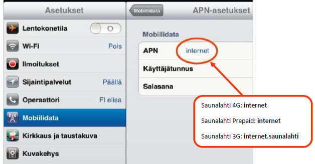 Yhteyspiste (APN) : mms.saunalahti.fi // Prepaid or 4G :mms