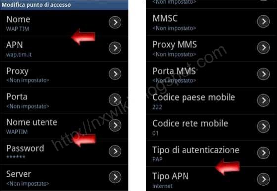 1. Configurazione APN MMS WAP Android/HTC/Samsung/Nexus: