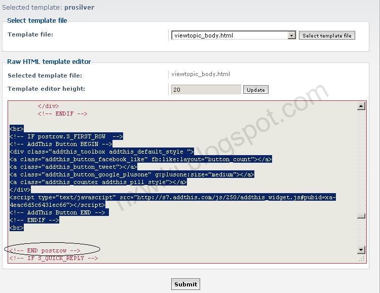How to Add Facebook Google+ Twitter sharing button after the first Post in phpBB
