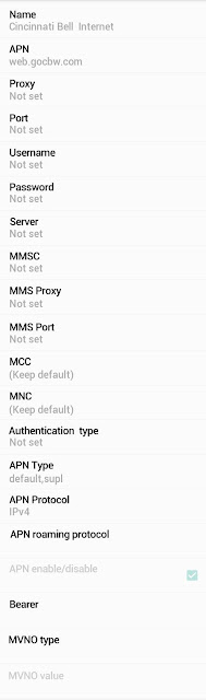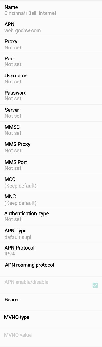 Just had the APN settings on my Droid Samsung 3g set by a Cincinnati Bell tech after the droid settings above stopped working suddenly. Works perfectly. BTW, he did this without looking anything up so I think it must be generic android settings.